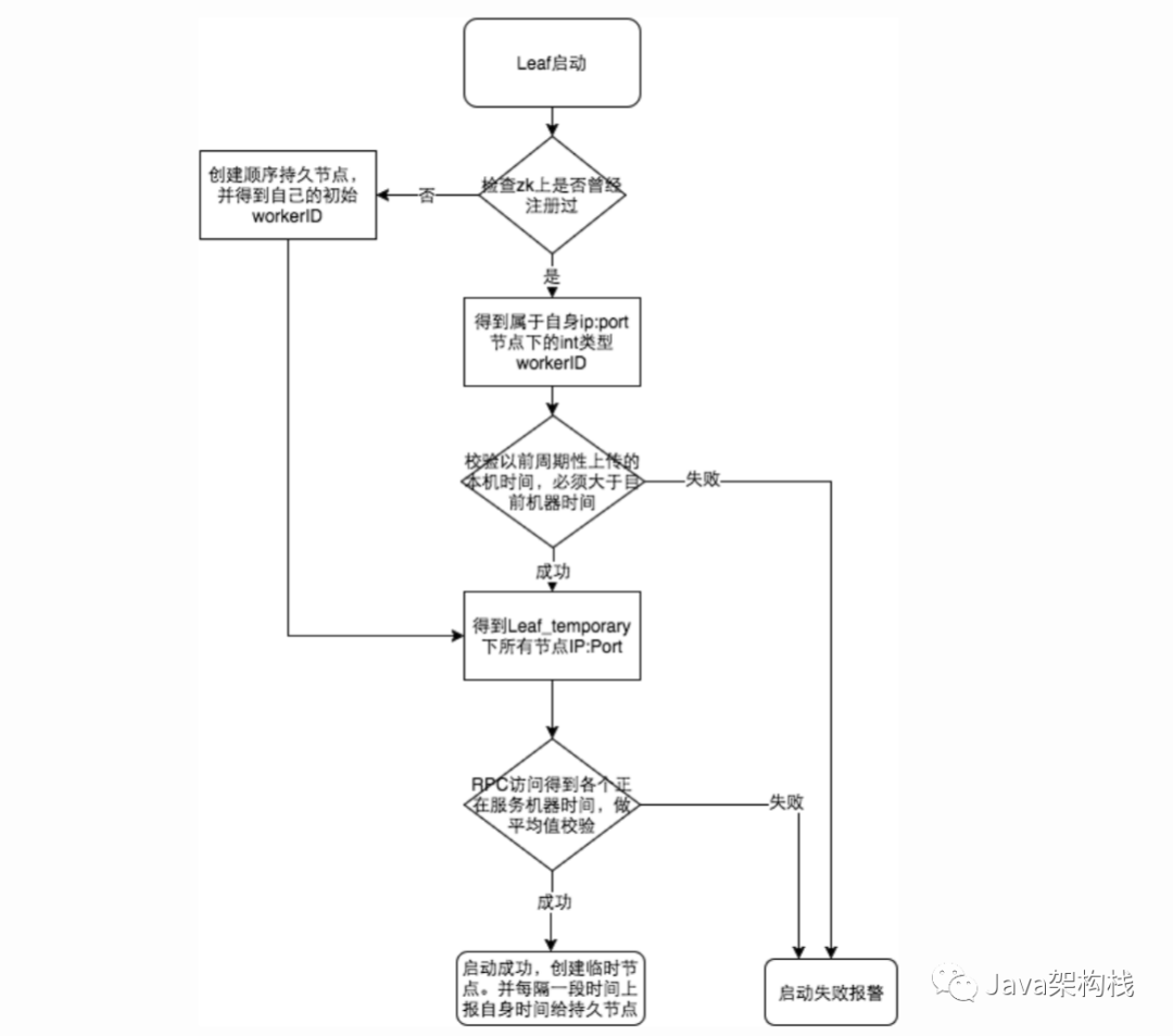 若写过,则用自身系统时间与leaf_forever/${self}节点记录时间做比较,若小于leaf_forever/${self}时间则认为机器时间发生了大步长回拨,服务启动失败并报警。