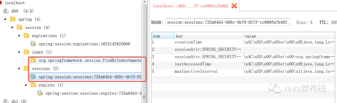 这时候我们启动项目后经过登录认证,就会在Redis中看到如下图所示的Session信息,证明Session创建及改变后,就会自动存储到指定的Redis服务器中,这样我们就很轻松的实现了Session共享,解决了集群会话的缺陷。