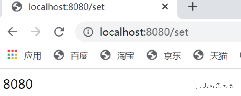 接着我们打开浏览器,访问http://localhost:8080/set接口,这样就在session中存储了一个用户信息,效果如下: