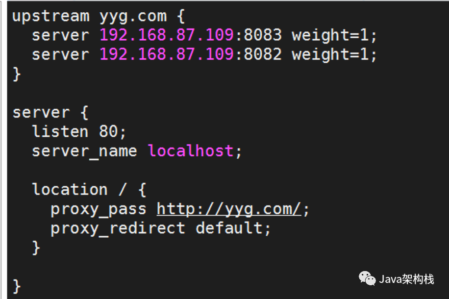 location 中的 proxy_pass 表示请求转发的地址,/ 表示拦截到所有的请求,转发转发到刚刚配置好的服务集群中