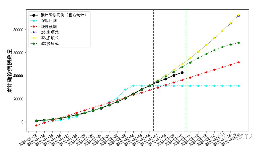 本文通过sklearn实现新型肺炎累计确诊病例的预测,主要算法包括线性回归,逻辑回国,多项式回归(二次曲线、三次曲线、四次曲线、五次曲线)等算法,具体到预测,主要包括算法的选择,很多时候算法的选择是通过数据的查全率查准率,训练集、测试集、检验集等上的准确率综合评估出来的,二是关于数据集的分拆,需要拆解为训练集、测试集分别进行验证。