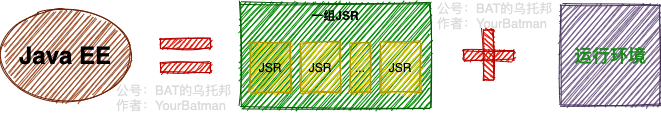 Java EE是由一系列抽象的标准规范所组成,是针对企业级软件开发中普遍面临问题的一套解决方案。简而言之:Java EE = N个JSR正式规范 + 一个运行环境。Java EE是代码的形式展现出来,而JSR只是文档。