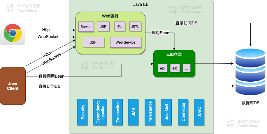 再回到上面那张Java EE的图,从图中可以看到Java EE自己其实就有两个容器:Web容器和EJB容器。