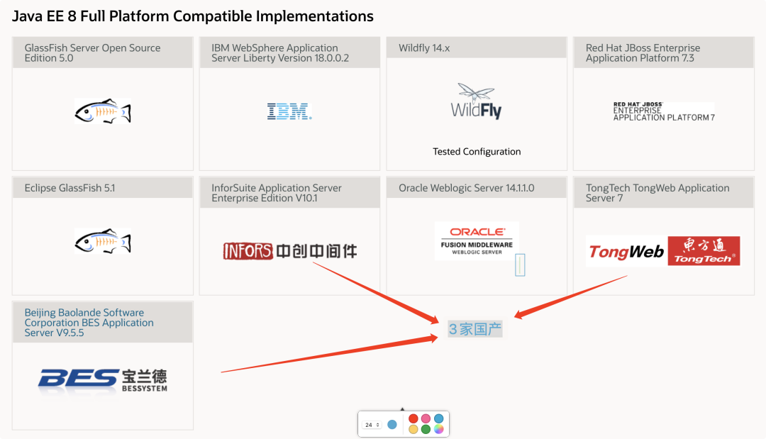 我在Oracle官网找来一张图,显示了支持Java EE 8的供应商产品(完整实现,并非只有web profile):
