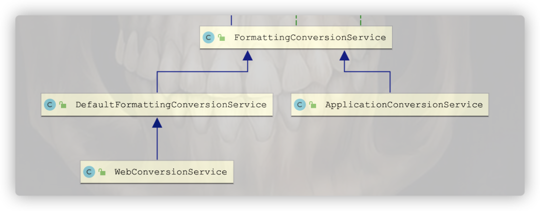 实现了FormatterRegistry接口,并且继承自GenericConversionService,所以功能上它是DefaultConversionService的超集。一般来讲,我们常说的ConversionService
