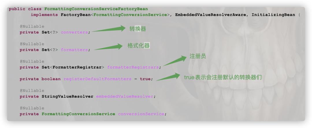 从这些成员变量就能看到注册转换器的所有手段都被包含了进来。细心的你有可能会疑问:咋没看到通过注解工厂AnnotationFormatterFactory的方式呀???