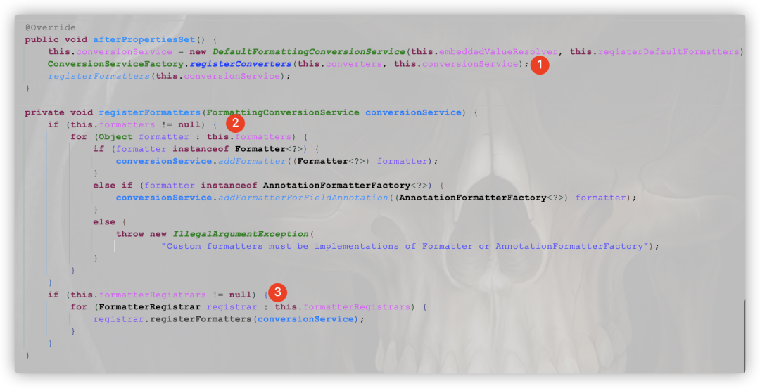 ③:负责处理注册员xxxRegistrar的批量注册动作。如DateTimeFormatterRegistrar和DateFormatterRegistrar等,关于注册员FormatterRegistrar详细介绍可参见这篇文章:11. 春节礼物:Spring的Registrar倒排思想送给你