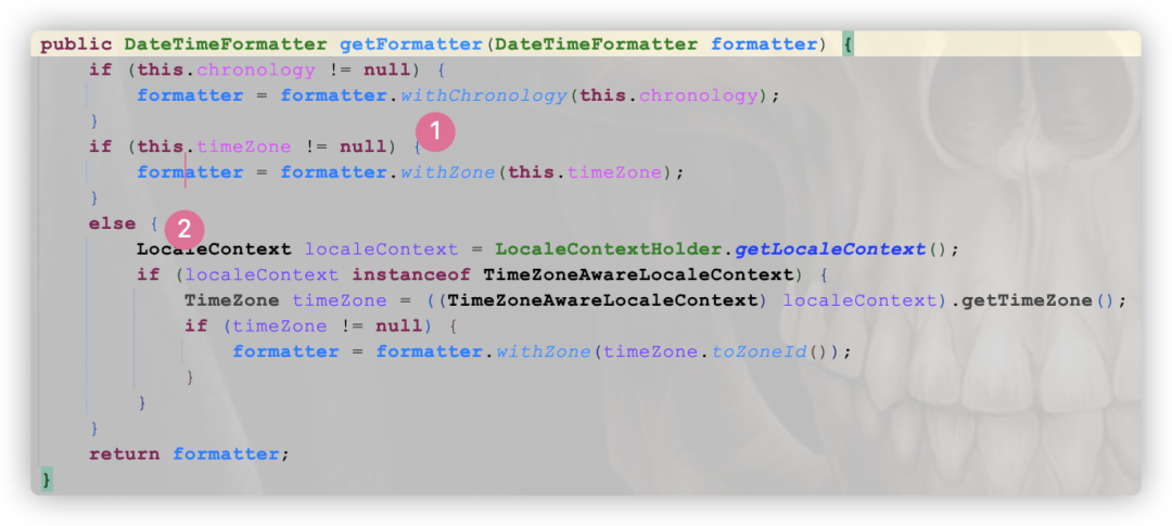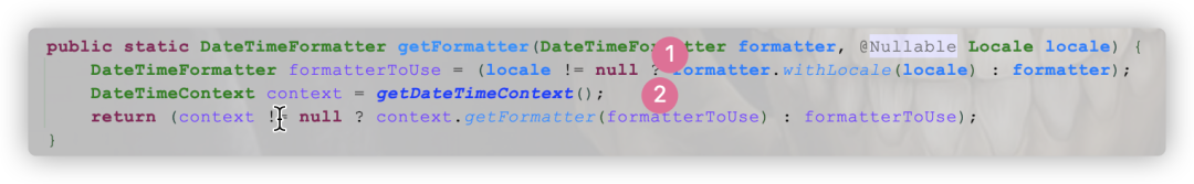 ①:给调用者传入的格式化器绑定上Locale属性,若存在的话②:获取到当前上下文对象DateTimeContext,进而根据当前上下文(若存在)得到加工后的DateTimeFormatter实例