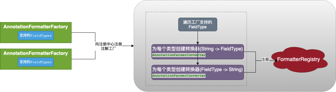 该流程可释义为:通过格式化器注册中心FormatterRegistry的API向其注册注解工厂AnnotationFormatterFactory以支持格式化注解。但是,底层其实都(为每个FieldType类型)适配为了Converter才注册到FormatterRegistry进去的。换句话讲:FormatterRegistry(其实是ConverterRegistry)底层管理的永远是一些简单的Converter转换器们,这便也符合了越底层越抽象,越上层越具体的设计原则,是一种良好的设计方案。