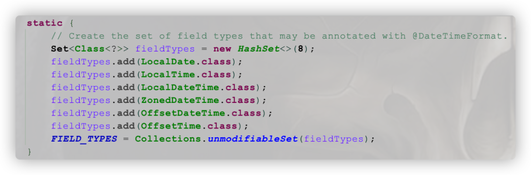 本系列前面文章介绍过的DateTimeFormatterFactory便是对DateTimeFormatter的简单包装,用于生产格式化器实例的工厂。此处的DateTimeFormatterRegistrar就使用它俩来进行一系列注册动作,因此可理解为他是更上层的封装形式。