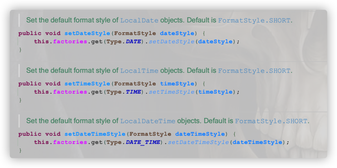 由于使用DateTimeFormatterFactory而并非直接使用DateTimeFormatter,就可以很方便的对不同类型做参数定制化,如下方法们,它们是作用在DateTimeFormatterFactory上的,从而可以确保多个条件共存: