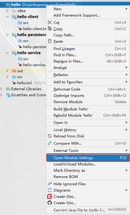 选项。Project Structure顾名思义,是针对Project维度的结构视窗,而你鼠标选中的hello只是个module,所以自然弹出的是对此module的操作菜单喽,而非Project的。也许你可能会讲:我点击了Open Module Settings