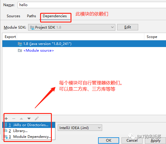 每个模块都能独立管理着自己的依赖,这种关系在模块自己的.iml文件中记录着。