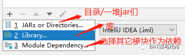 jar包依赖,可以点击Dependencies标签页左下角的+号,选择Library: