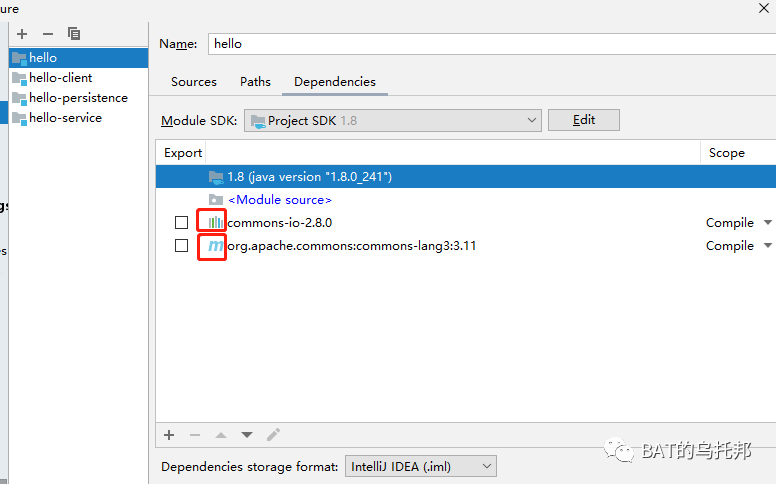 通过这两种方式各执行一次添加新的依赖完成后,再看hello模块的依赖情况,效果如图: