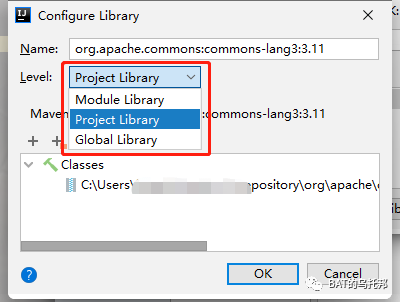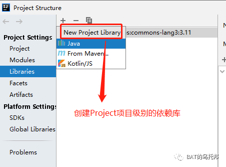 当某Library是所有/大部分模块都需要的依赖时,就可以上升为Project级别的依赖,抽取到Libraries标签页来统一管理。如图,因为上面步骤创建的commons-lang3是项目级别的,所以也会出现在这里。