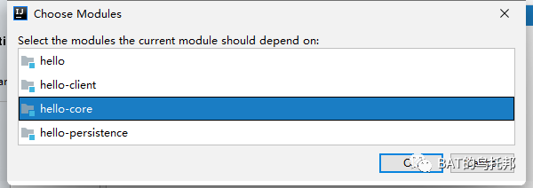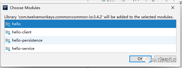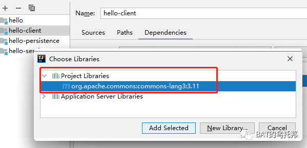 在本例中commons-io是模块级别,commons-lang3是项目级别。因此hello-client模块添加依赖时也是能够看到commons-lang3这个依赖的(但看不见commons-io):