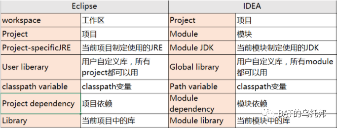 正是由于有这样的历史进程,有大批“老”程序员是从Eclipse过度到IDEA来的,因此就有了一个颇具代表性的概念对比表格,方便“迁移”: