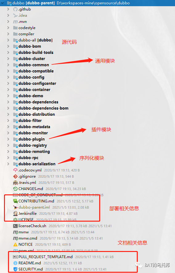 在IDEA中,Project项目是最顶级的结构单元,一个IDEA视窗有且只能代表一个Project 现在知道为何把user、account、order扔到一个视窗里有多么的不合适了吧 一个Project由一个or多个Module模块组成,对于大型项目来讲一般会有N多个module组成,如dubbo项目结构如下图所示: