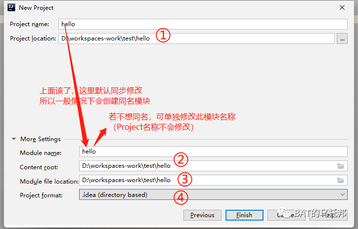 ①:项目存储位置,一般作为整个项目的根目录 ②:内容根目录 ③:模块文件存放的目录 ④:项目格式文件(IDEA负责识别,后面它还会出镜)