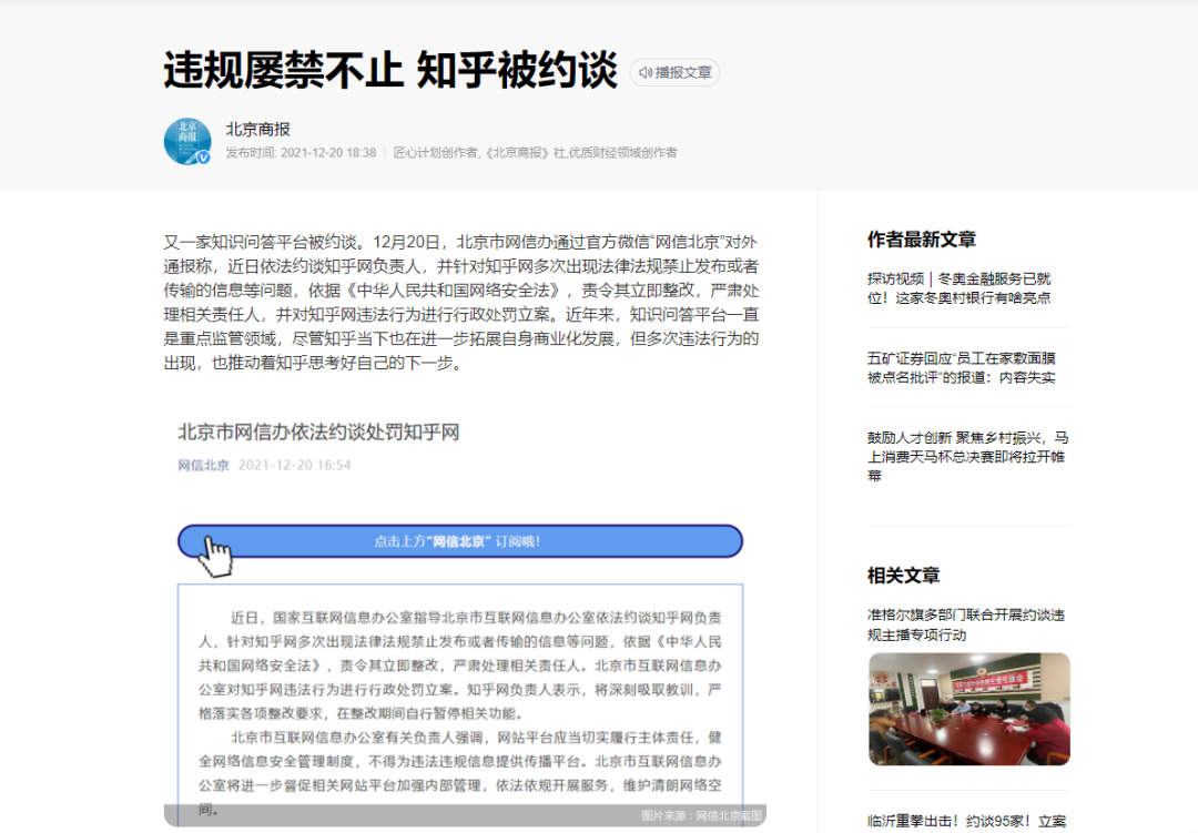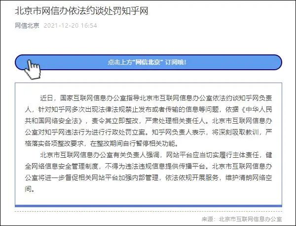 据微信公众号“网信北京”12月20日的消息,北京市互联网信息办公室宣布,已针对知乎网多次出现法律法规禁止发布或者传输的信息等问题,依法约谈知乎网负责人。