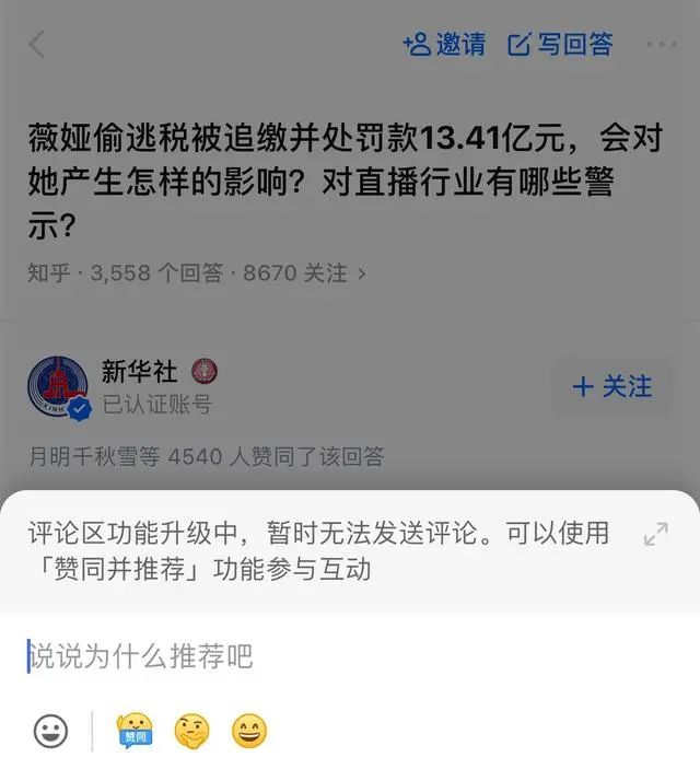 点击评论功能,评论区上方会显示:“评论区功能升级中,暂时无法发送评论。可以使用‘赞同并推荐’功能参与互动”。