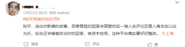 “知乎,恶意辱骂的回答会高赞,然后一堆人在评论区里人身攻击以此为乐,后台还会偷偷改动你的回答,被资本控场,这种平台确实要好好整改”。