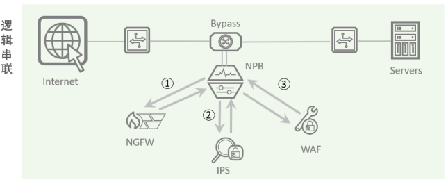 这样做的好处是,可以避免物理串联时,因单个设备故障带来的业务中断,同时最大化使用安全工具来保护网络,免遭网络流入威胁对企业造成影响。