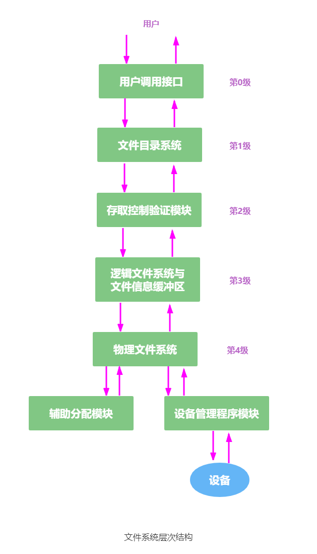 文件系统为用户提供与文件及目录有关的调用,如新键、打开、读写、关闭、删除文件、建立、删除目录等。此层由若干程序模块组成,每个模块对应一条系统调用,用户发出系统调用时,控制即转入相应的模块。