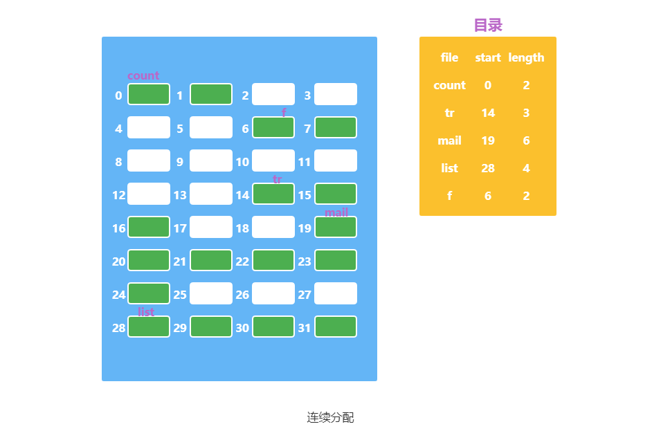 连续分配方法为每个文件在磁盘上分配一组连续的块,如下图所示。磁盘地址定义了磁盘上的一个线性排序,这种排序使作业访问磁盘时需要的寻道数和寻道时间最小。采用连续分配方式时,可把逻辑文件中的记录顺序地存储到邻接的各物理盘块中,所形成的文件结构称为顺序文件结构。