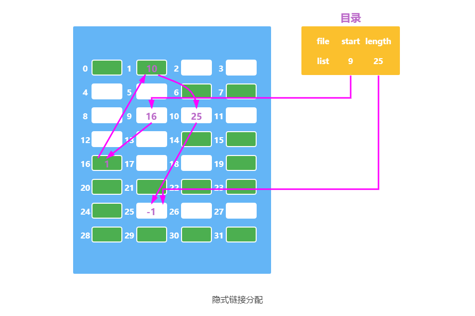 隐式链接如下图所示。每个文件对应一个磁盘块的链表,磁盘块分布在磁盘的任何地方,除最后一个盘块外,每个盘块都有指向下一个盘块的指针。目录项中需包含文件第一个盘块的指针和最后一个盘块的指针。