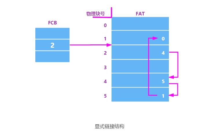 显式链接是指把用于链接文件各物理块的指针,从物理块中取出,显式地存放在内存的一张链表中。该表在整个磁盘仅设置一张,每个表项中存放以对应盘块的下一个盘块的链接指针,如下图所示。