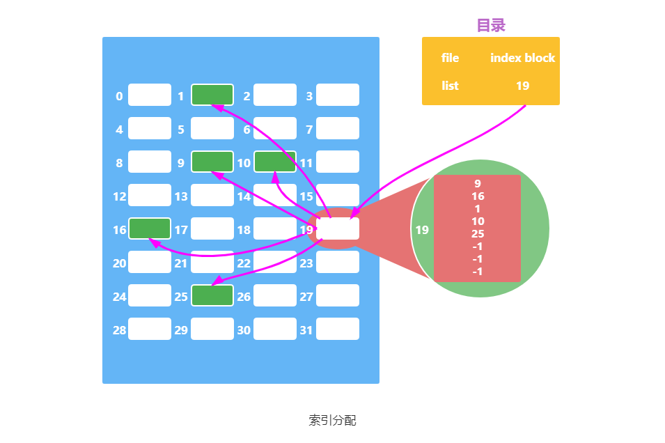索引分配是指把每个文件的所有盘块号都集中放在一起构成索引块或索引表的索引式文件结构,来解决链接分配不能有效支持直接访问的问题,如下图所示。