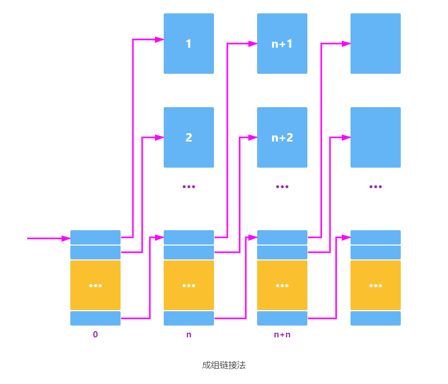 成组链接法是把顺序的 n 个空闲扇区地址保存在第一个空闲扇区内,其后一个空闲扇区内则保存另一顺序空闲扇区的地址,如此继续,直至所有空闲扇区均予以链接。系统只需要保存一个指向第一个空闲扇区的指针。假设磁盘最初全为空闲扇区,其成组链接如下图所示。通过这种方式可以迅速找到大批空闲块地址。