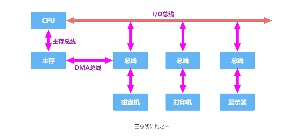 三总线结构中,任一时刻只能使用一种总线。主存总线与 DMA 总线不能同时对主存进行存取,I/O 总线只有在 CPU