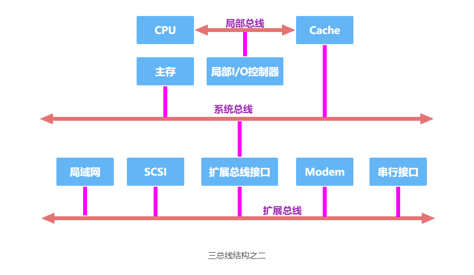 另一种三总线结构采用的是局部总线、系统总线和扩展总线,如下图所示。
