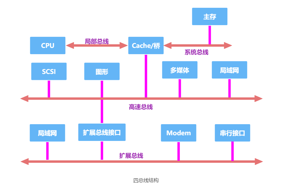 四总线结构通过局部总线、系统总线、高速总线和扩展总线四种总线连接计算机系统各部件,如下图所示。