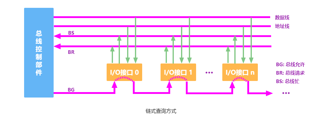 该方式的优点是响应速度快,总线允许信号 BG 直接从控制器发送到有关设备,而不必在设备间传递或查询,而且对优先次序的控制相当灵活;但缺点是控制线数量多(设备有 n 个,需要 2n+1