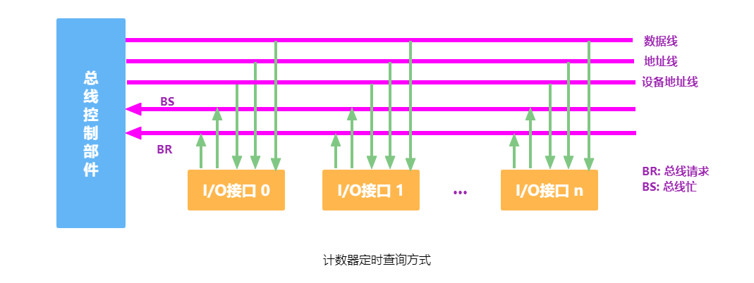 计数器定时查询方式如下图所示。采用一个计数器控制总线使用权,相对链式查询方式多了一组设备地址线,少了一根总线响应线 BG。它仍共用一根总线请求线,当总线控制器收到总线请求信号并判断总线空闲时,计数器开始计数,计数值通过设备地址线发向各个部件。当地址线上的计数值与请求使用总线设备的地址一致时,该设备获得总线控制权,同时中止计数器的计数及查询。