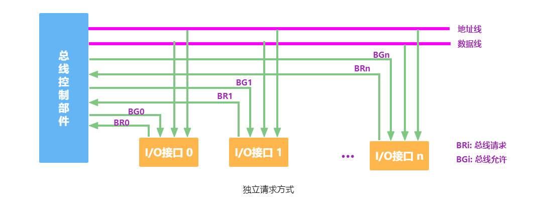 独立请求方式如下图所示。每个设备均有一对总线请求线 和总线允许线 。当总线上的部件需要使用总线时,经各自的总线请求线发送总线请求信号,在总线控制器中排队,当总线控制器按一定的优先次序决定批准某个部件的请求时,给该部件发送总线响应信号,该部件接到此信号后就获得了总线使用权,开始传送数据。
