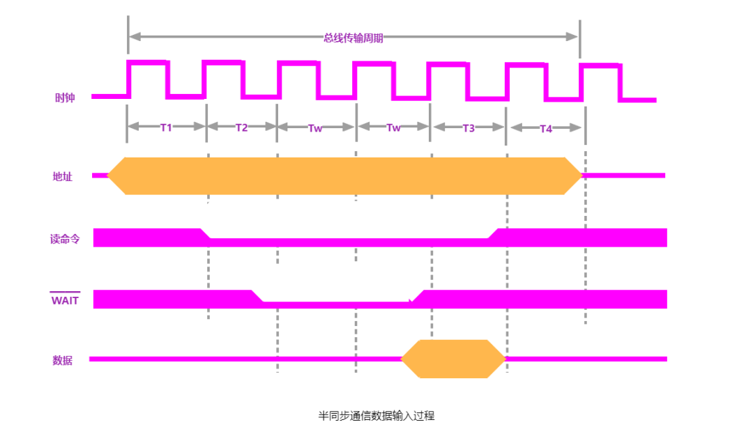 半同步通信既保留了通信特点如信号发出时间严格参照系统时钟某个前沿开始,接收方采用系统时钟后沿时刻判断识别;又想异步通信允许不同速度的模块和谐工作。为此增设一条等待() 响应信号线,采用插入时钟周期的措施来协调通信双方的配合问题。