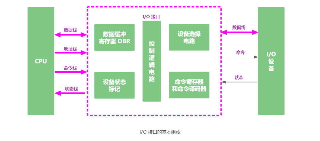 为使 I/O 接口实现基本功能,需要具有相应的逻辑电路,基本结构如下图所示。