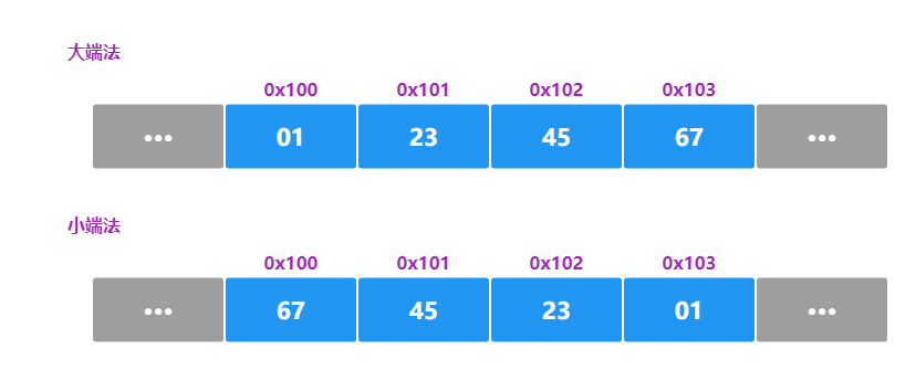 多字节对象在存储器中有两个通用的排列规则,即小端法和大端法。