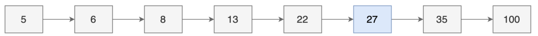 比如假设下面一个普通的链表,如果想要查找元素27,该如何查找呢?