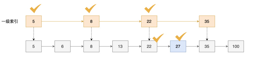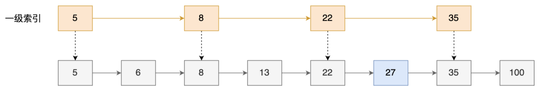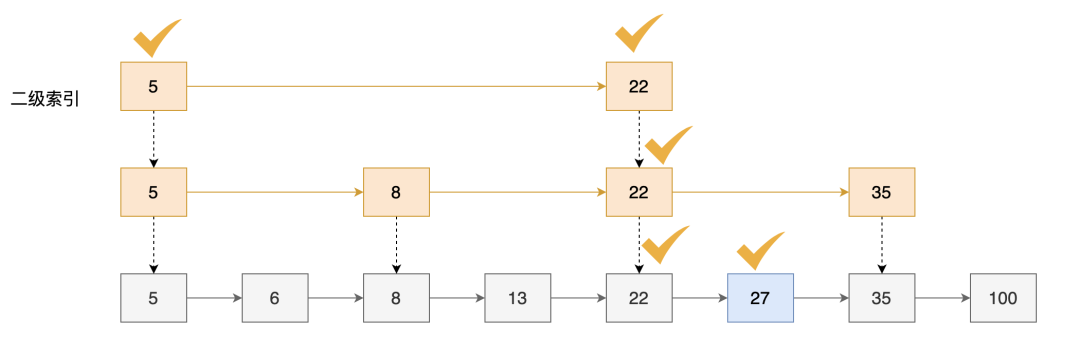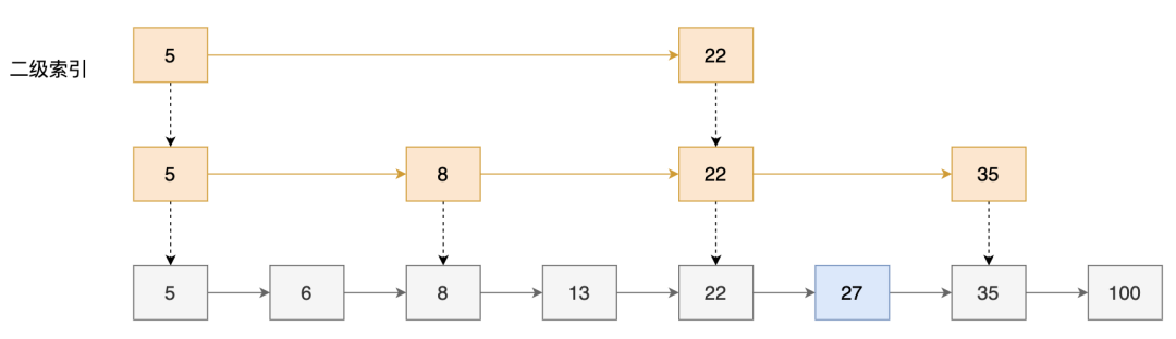 利用二级索引,我们只需要遍历 5个节点 就可以找到元素27。