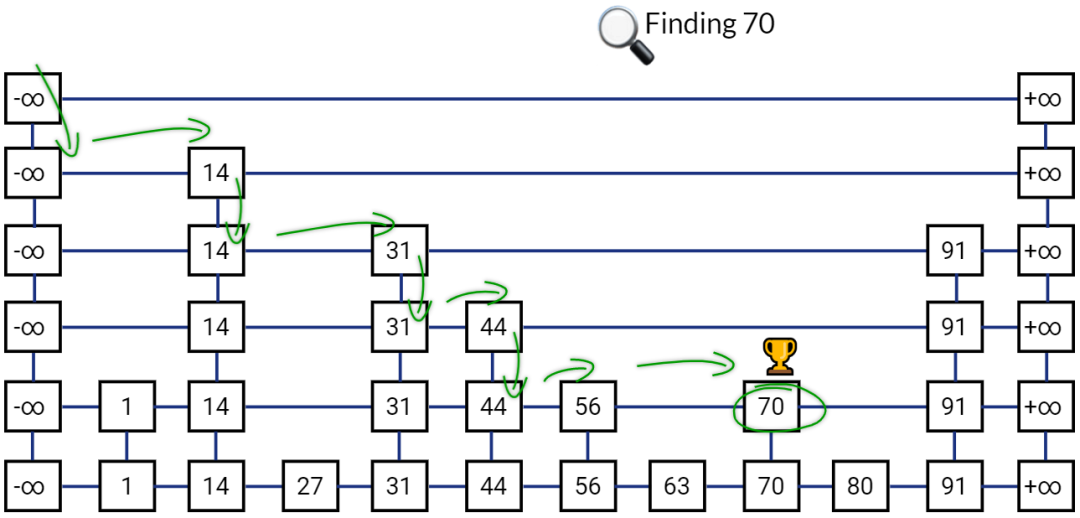 普通链表的查找一个元素时间复杂度为 O(n),而跳表的查找一个元素时间复杂度为 O(logN),速度更快。