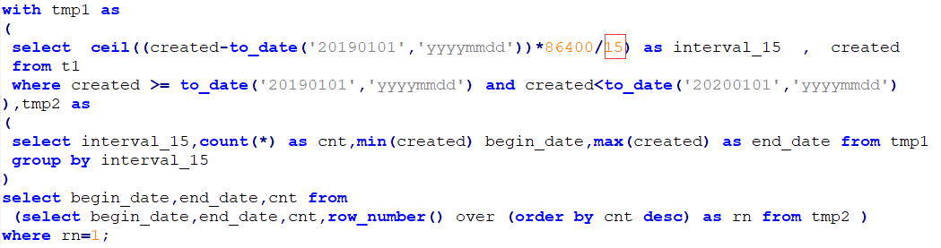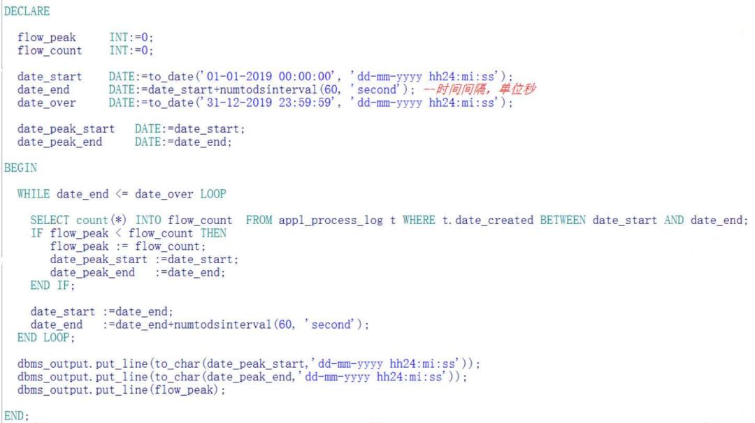 这段代码的业务逻辑是找到2019年业务量最多的61秒(我想本意应该是60秒,代码不够严谨)间隔及业务量。