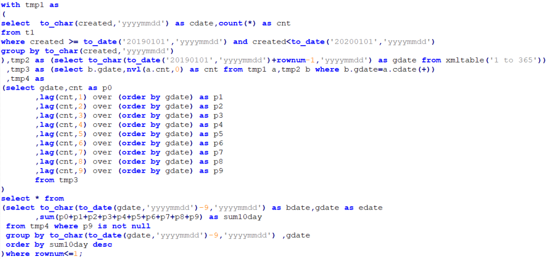 上面的查询,间隔的起点是固定的,这种写法还不是太复杂。如果我们再把这个问题延伸一下,比如查一年内哪个连续10天的业务量最高,sql相对就复杂一些,下面是我给出的写法: