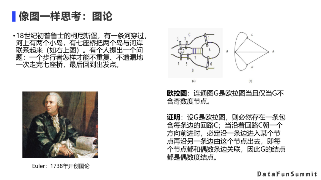 图论在1738年由欧拉开创,解决柯尼斯堡七桥问题,用图将不同区域建模成点,把桥建模成边,通过图解决了实际问题并发展出了图论。