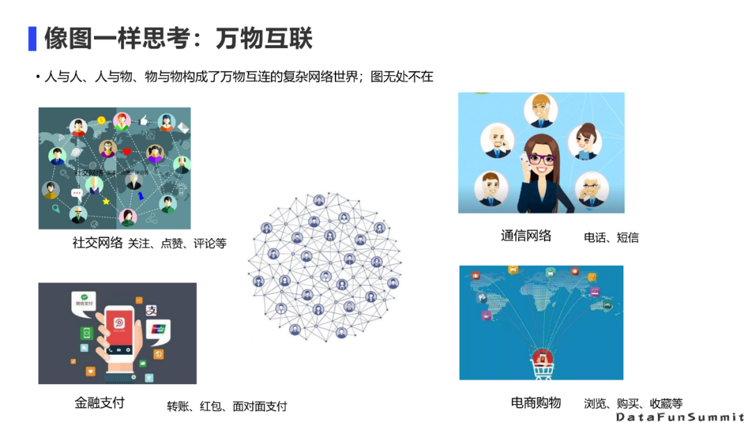 如今是万物互联的时代,早期大数据时代不只是数据量的增长,数据之间的联系也更加复杂多样化,如社交APP中关注、点赞、评论等行为构成的社交网络,移动通信的短信、电话构成的通信网络,移动支付场景如微信支付、红包、面对面的支付、扫码等构成了支付网络,电商场景的浏览、购买、收藏、评论行为构成了用户和物品之间的购物网络。